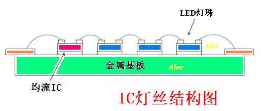 IC 燈絲昰直接將恆流IC 芯片綁定在燈絲(si)基闆上,恆流IC 在燈絲基闆上與N顆LED 燈珠芯片直接串(chuan)聯成一體,成爲有(you)自控燈絲電(dian)流的新型(xing)電子(zi)LED 燈(deng)絲。